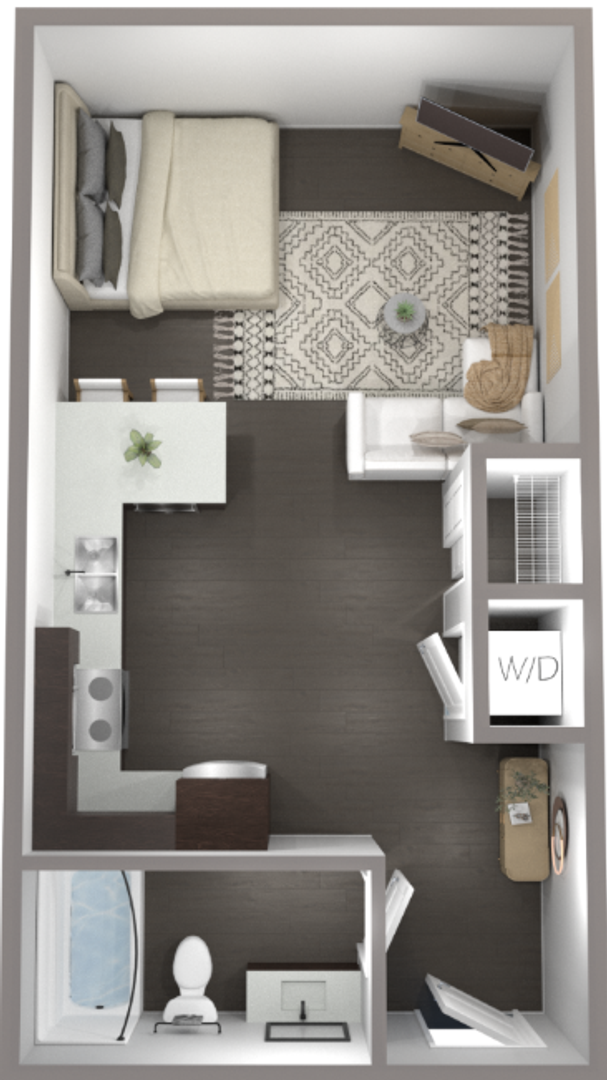 This brand-new studio offers a thoughtfully designed open layout that makes everyday living easy and efficient. Modern finishes throughout include luxury vinyl plank flooring, granite countertops, and sleek contemporary fixtures. The kitchen features full-size appliances and new cabinetry for a polished look. With in-unit laundry and high-efficiency HVAC, comfort and convenience are built in. Pet-friendly and low-maintenance, this studio is ideal for those who appreciate smart design and modern style. A central skylight in this unit allows for natural light to flow in from above. Layout varies by unit.